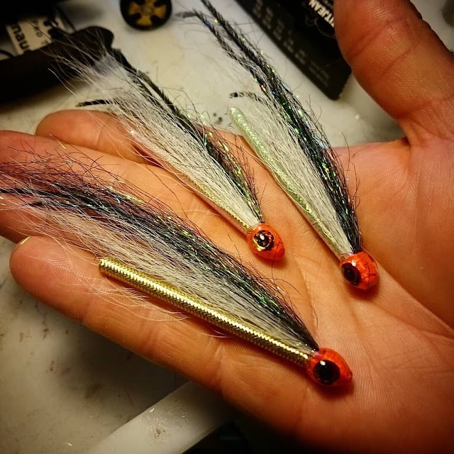 Hier une bonne journée de montage. Des "magic heads" ( de chez Marc PetitJean) pour tempter les truites de mer et quelques bars rayés. Polar hair pour l'intégralité du montage, de l'epoxy pour les yeux, et les fameuses magic heads pour donner du mouvement.Le tout monté sur des Sakumas 410 en 1/0.